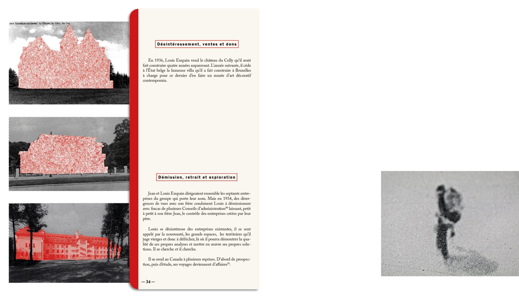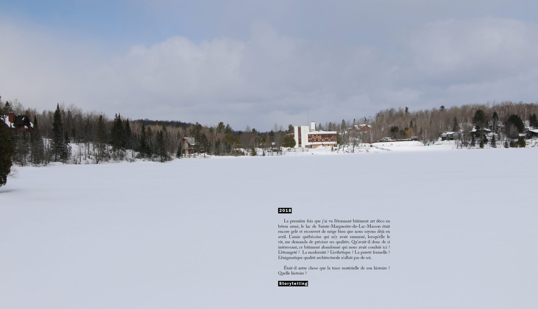 La première concerne un bâtiment construit par l’architecte Antoine Courtens dans les Laurentides, au Canada, à la demande d’un riche homme d’affaire, Louis Empain. Elle a donné lieu à une exposition au centre d’art et d’essai Occurrence à Montréal en 2020 : échoué n’est pas coulé.
