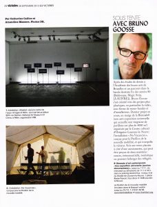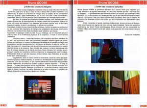 Bruno GOOSSE – L’ordre des couleurs balayées, Guillaume THIBURS Entre interaction et rigidité, symbole et abstraction, illusion et refus de l’illusion, cette oeuvre pense les signes de notre monde hyper-médiatisé. Dans une approche plasticienne qui induit l’étude sémiologique, Bruno Goosse sait les possibilités du médium vidéo, avec lequel il ouvre des pistes sur la place…