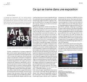 Ce qui se trame dans une exposition, Tristan Trémeau, l’artmême n°32, 3e tr. 2006 Cette seconde exposition devrait manifester ce que l’expérience de l’artiste vécue à Troyes a déterminé comme déplacements qualitatifs de son regard sur son travail, en l’attente de ce qu’elle suscitera comme déplacement dans l’économie de celui-ci.