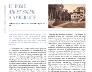 Le home air et soleil à Amberloup, par Nicole Gesché, cultural heritage consultant, dans Les nouvelles du patrimoine 169, janv 2022. « Quand l’art contemporain ose interroger les fondements mêmes des ‘valeurs’ accordées au patrimoine afin de lui éviter de peut-être tomber trop vite dans l’oubli, l’on ne peut que se réjouir des questions ainsi soulevées…